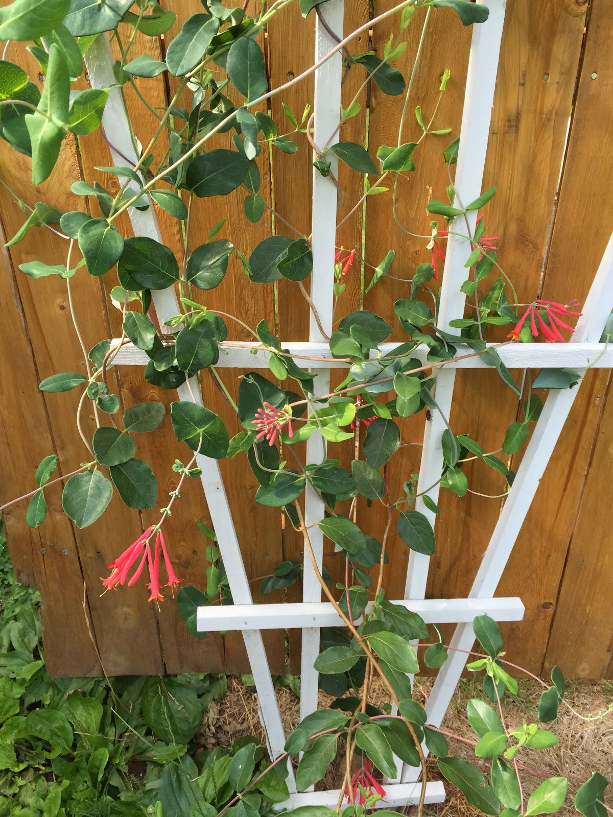 In 2014 this honeysuckle did not do much in its white pot by the deck stairs. It was there, and a vining tendril grew, but no flowers, and the vine remained about two feet long. Will it always sulk being in a pot? Wrong place for it?